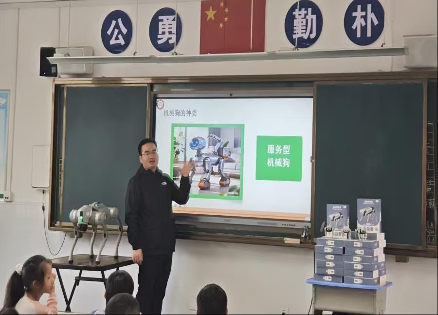陈洋卓还将复杂的技术知识与小学生能理解的 “身体结构”相类比,讲解了机械狗工作原理。他指出,机械狗能灵活运动,离不开三大核心系统:一是“感知器官”——传感器系统,它能像眼睛和耳朵一样收集距离、速度、障碍物等环境信息,帮助机械狗自主导航、避开障碍;二是“运动肌肉”——驱动与执行机构,由伺服电机驱动腿部关节,模拟真实狗的步态,让机械狗完成行走、奔跑等动作;三是“大脑中枢”——控制系统,内置的微处理器会处理传感器收集的数据,指挥机械狗做出运动决策。陈洋卓还通过动画演示,介绍了机械狗的平衡控制原理,并现场播放了机械狗“摔跤”“笨拙转身”等小视频,让同学们在实际观察中加深了对机械狗运动原理的理解。